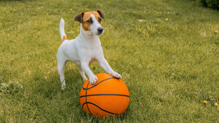 Dog jack russell terrier with a basketball ball on a green lawn